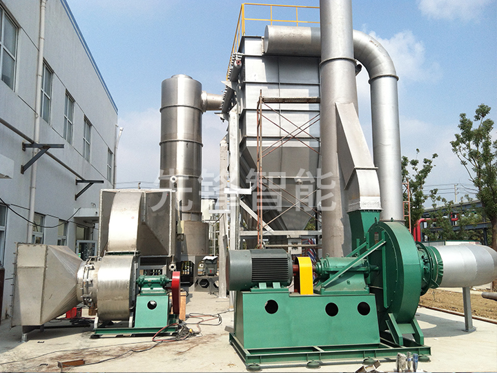 經(jīng)過初、中效過濾的環(huán)境空氣由鼓風(fēng)機依次鼓入間接燃煤熱風(fēng)爐加熱至工藝設(shè)定溫度,進入閃蒸干燥主機,與經(jīng)過螺旋加料器送入干燥主機的待干燥濾餅,在干燥主機內(nèi)完成傳熱傳質(zhì)的干燥過程,氣固混合物依次經(jīng)過旋風(fēng)分離器和布袋除塵器分離、過濾后,粉粒狀物料被從干燥系統(tǒng)氣體內(nèi)分離出來,排出干燥系統(tǒng),尾氣由引風(fēng)機排入大氣。